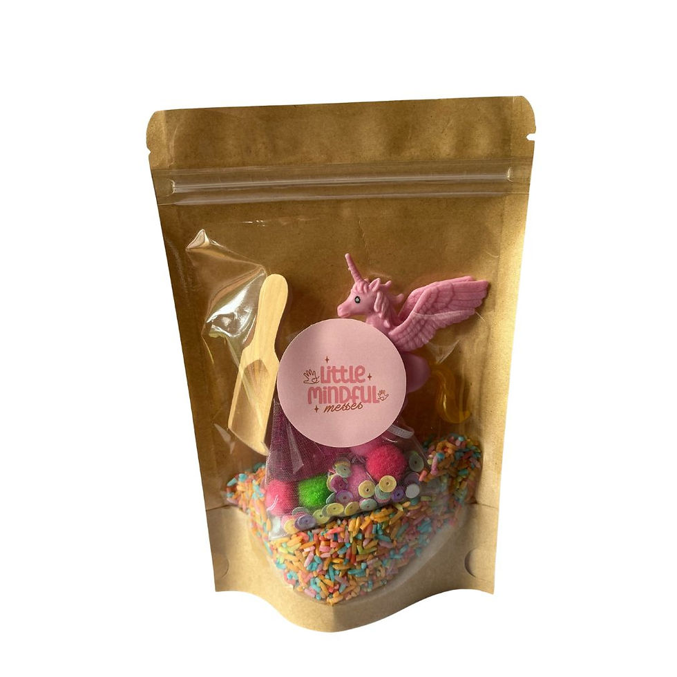 Designed for curious little learners, this kit is packed with hands on sensory fun and playful learning opportunities. Inside you’ll find a cute mini heart cup, colourful rice 'sprinkles', glitter, pom poms, soft handmade playdough, themed toys, kid friendly tools, and prompt cards to guide learning, storytelling and imaginative play.